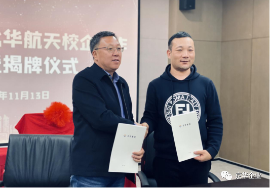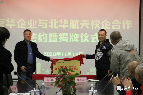 揭牌儀式上(shàng),北華航天工業學院校(xiào)長陳剛、京華企業總經理(lǐ)陳鐵(tiě)柱一起為(wèi)此次校(xiào)企合作(zuò)揭牌。